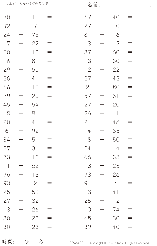 上記のボタンから「くり上がりのない2桁の足し算」の算数数学ドリル・計算ドリル(PDFプリント)がダウンロードできます。個人利用は無料です(家庭以外での配布は有料です)。