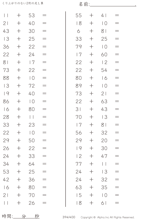 上記のボタンから「くり上がりのない2桁の足し算」の算数数学ドリル・計算ドリル(PDFプリント)がダウンロードできます。個人利用は無料です(家庭以外での配布は有料です)。