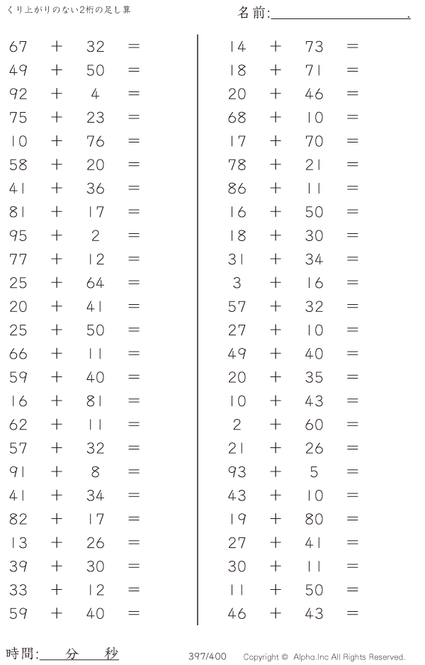 上記のボタンから「くり上がりのない2桁の足し算」の算数数学ドリル・計算ドリル(PDFプリント)がダウンロードできます。個人利用は無料です(家庭以外での配布は有料です)。