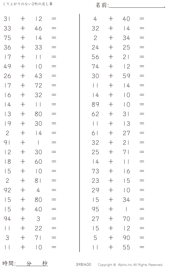 上記のボタンから「くり上がりのない2桁の足し算」の算数数学ドリル・計算ドリル(PDFプリント)がダウンロードできます。個人利用は無料です(家庭以外での配布は有料です)。