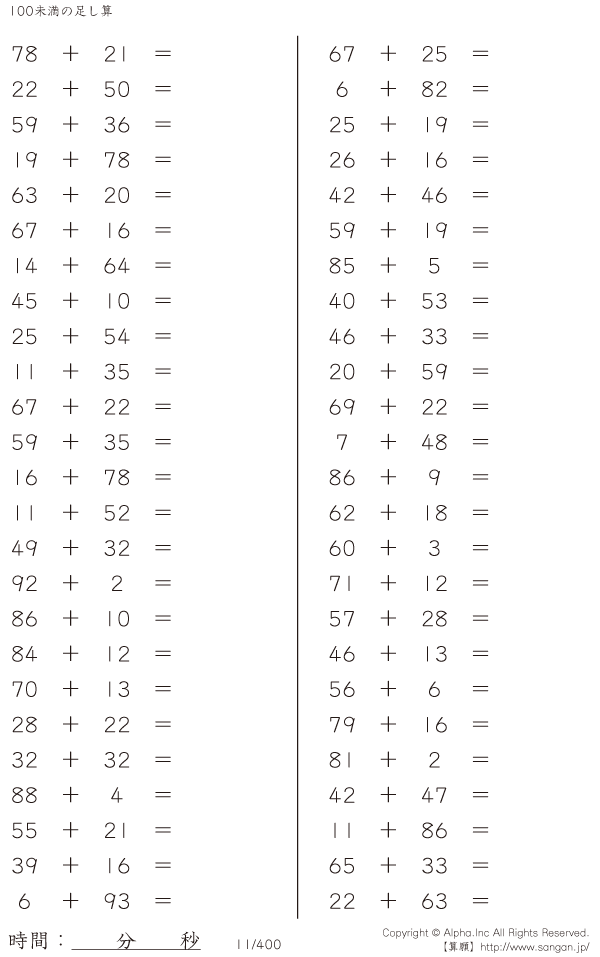 上記のボタンから「100未満の足し算」の算数数学ドリル・計算ドリル(PDFプリント)がダウンロードできます。個人利用は無料です(家庭以外での配布は有料です)。
