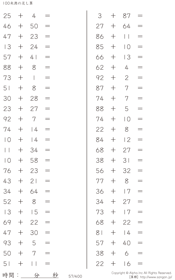 上記のボタンから「100未満の足し算」の算数数学ドリル・計算ドリル(PDFプリント)がダウンロードできます。個人利用は無料です(家庭以外での配布は有料です)。