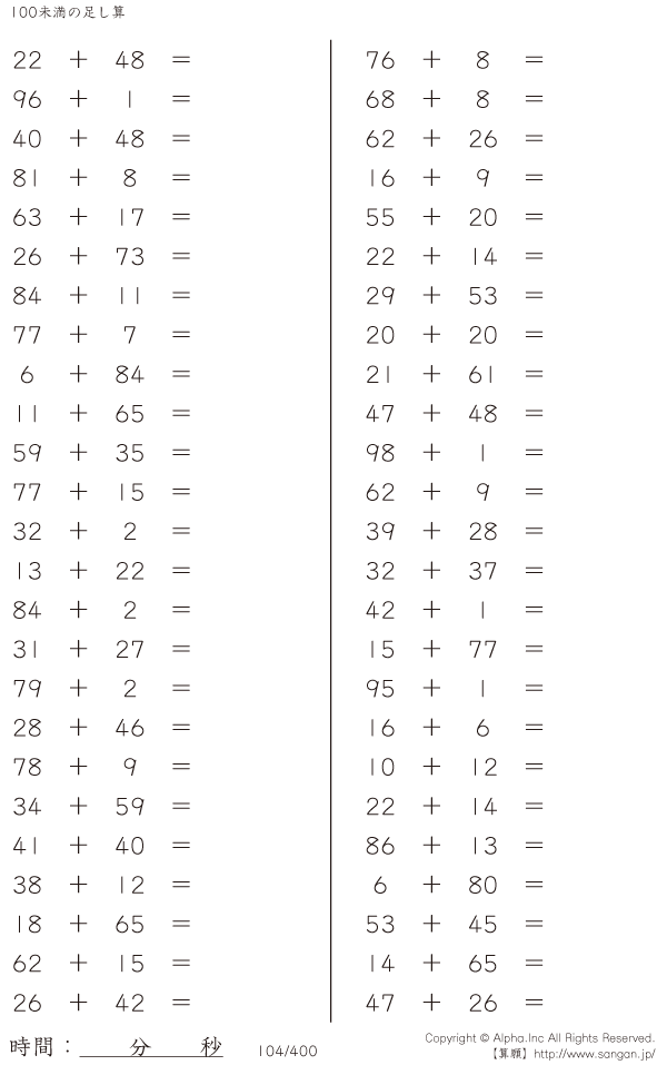 上記のボタンから「100未満の足し算」の算数数学ドリル・計算ドリル(PDFプリント)がダウンロードできます。個人利用は無料です(家庭以外での配布は有料です)。