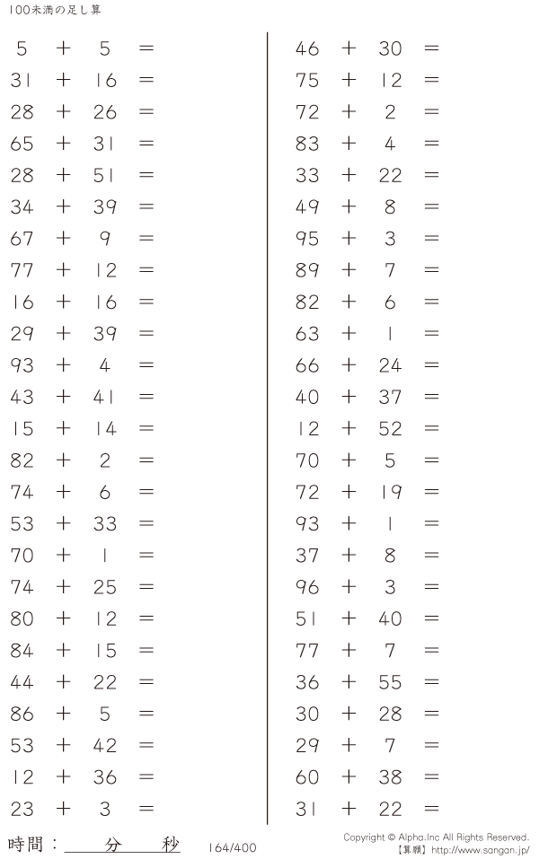 上記のボタンから「100未満の足し算」の算数数学ドリル・計算ドリル(PDFプリント)がダウンロードできます。個人利用は無料です(家庭以外での配布は有料です)。