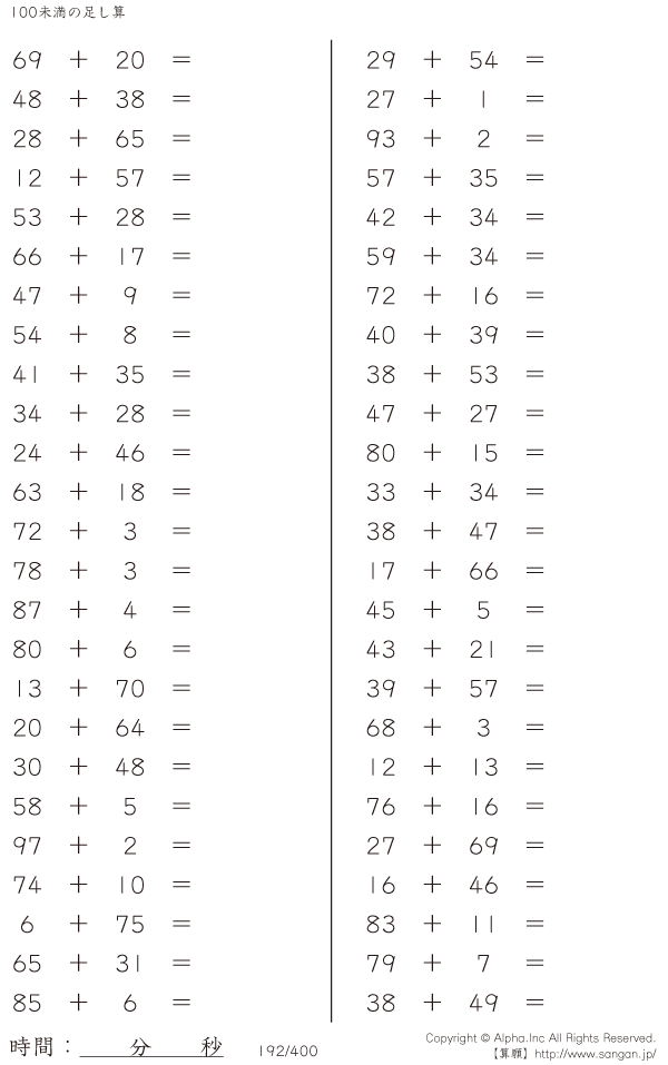 上記のボタンから「100未満の足し算」の算数数学ドリル・計算ドリル(PDFプリント)がダウンロードできます。個人利用は無料です(家庭以外での配布は有料です)。
