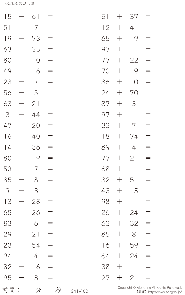 上記のボタンから「100未満の足し算」の算数数学ドリル・計算ドリル(PDFプリント)がダウンロードできます。個人利用は無料です(家庭以外での配布は有料です)。
