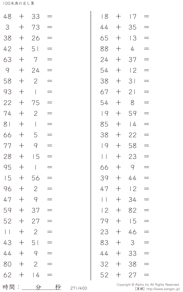 上記のボタンから「100未満の足し算」の算数数学ドリル・計算ドリル(PDFプリント)がダウンロードできます。個人利用は無料です(家庭以外での配布は有料です)。