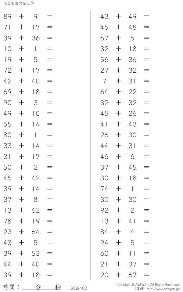 上記のボタンから「100未満の足し算」の算数数学ドリル・計算ドリル(PDFプリント)がダウンロードできます。個人利用は無料です(家庭以外での配布は有料です)。