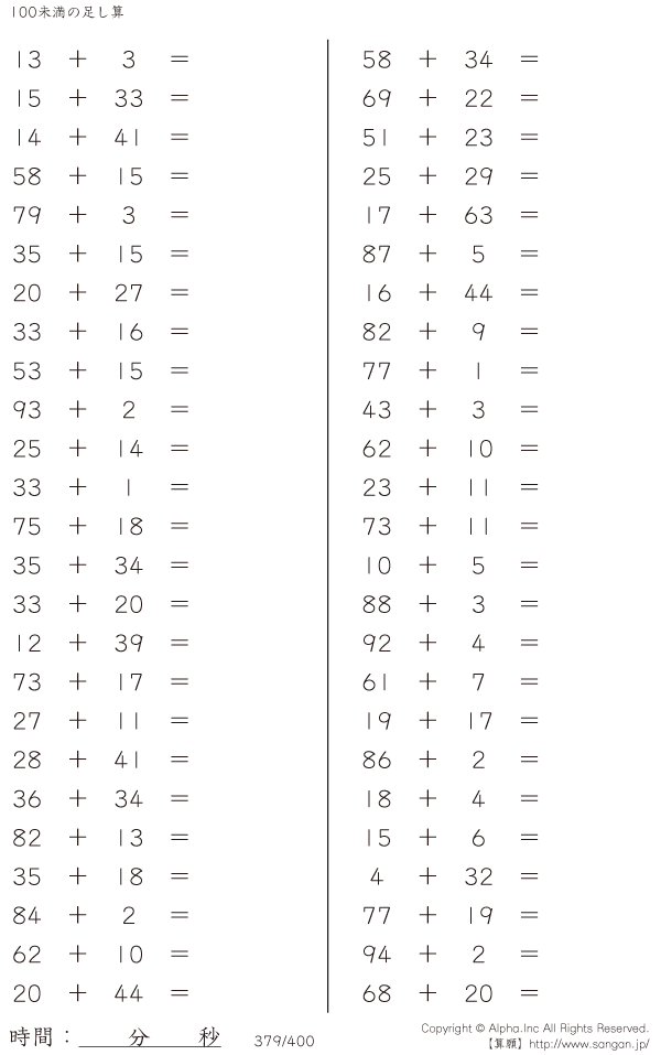 上記のボタンから「100未満の足し算」の算数数学ドリル・計算ドリル(PDFプリント)がダウンロードできます。個人利用は無料です(家庭以外での配布は有料です)。