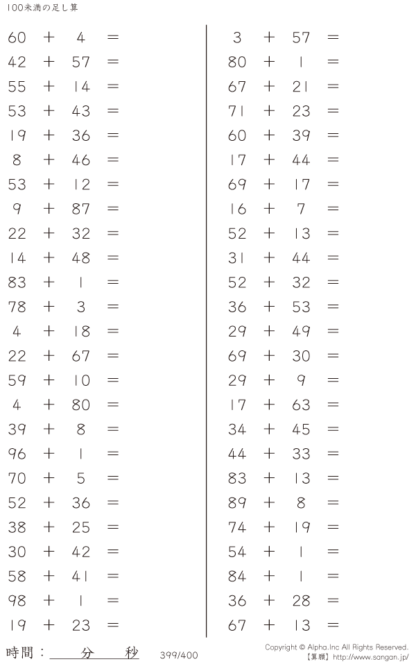上記のボタンから「100未満の足し算」の算数数学ドリル・計算ドリル(PDFプリント)がダウンロードできます。個人利用は無料です(家庭以外での配布は有料です)。