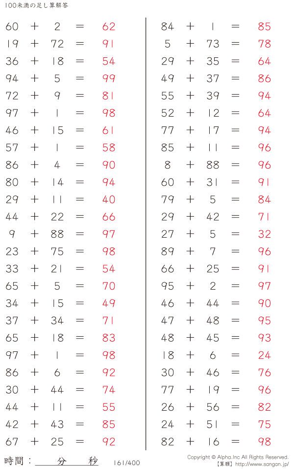上記のボタンから「100未満の足し算」の算数数学ドリル・計算ドリル(PDFプリント)がダウンロードできます。個人利用は無料です(家庭以外での配布は有料です)。