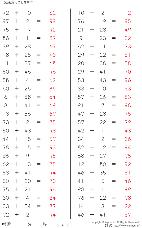 上記のボタンから「100未満の足し算」の算数数学ドリル・計算ドリル(PDFプリント)がダウンロードできます。個人利用は無料です(家庭以外での配布は有料です)。