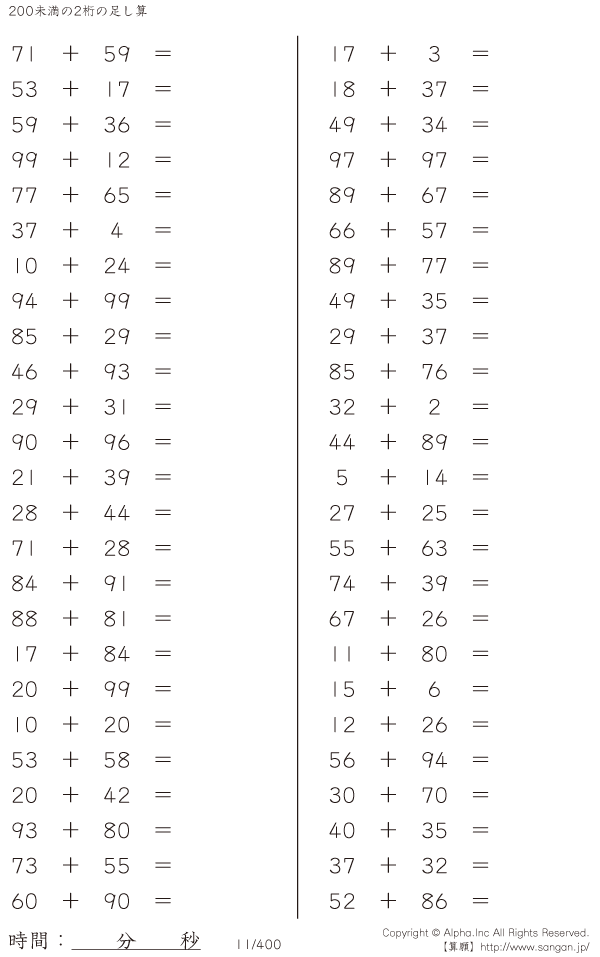 上記のボタンから「200未満の2桁の足し算」の算数数学ドリル・計算ドリル(PDFプリント)がダウンロードできます。個人利用は無料です(家庭以外での配布は有料です)。