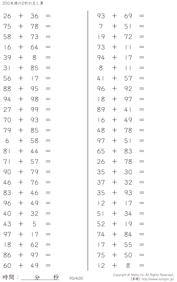 上記のボタンから「200未満の2桁の足し算」の算数数学ドリル・計算ドリル(PDFプリント)がダウンロードできます。個人利用は無料です(家庭以外での配布は有料です)。