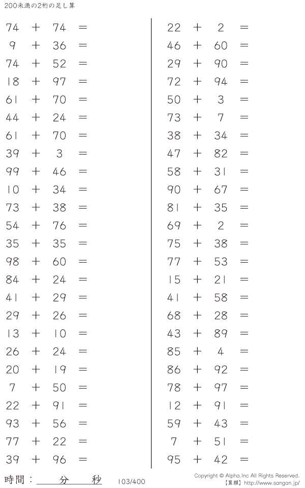 上記のボタンから「200未満の2桁の足し算」の算数数学ドリル・計算ドリル(PDFプリント)がダウンロードできます。個人利用は無料です(家庭以外での配布は有料です)。