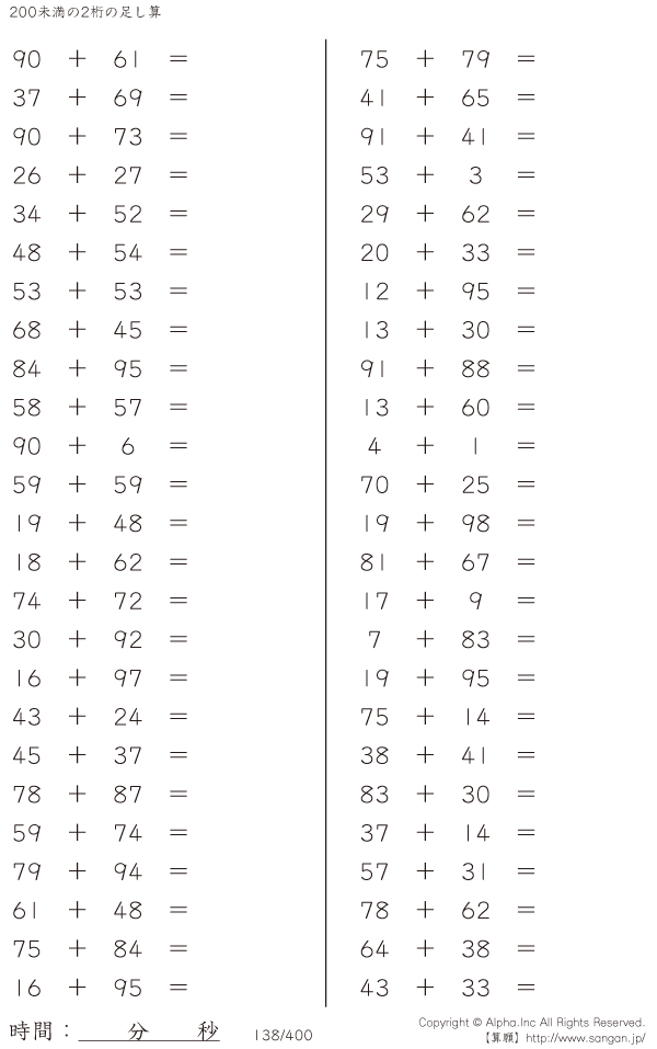 上記のボタンから「200未満の2桁の足し算」の算数数学ドリル・計算ドリル(PDFプリント)がダウンロードできます。個人利用は無料です(家庭以外での配布は有料です)。