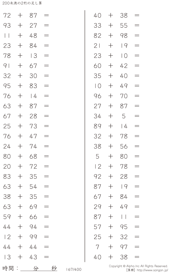 上記のボタンから「200未満の2桁の足し算」の算数数学ドリル・計算ドリル(PDFプリント)がダウンロードできます。個人利用は無料です(家庭以外での配布は有料です)。