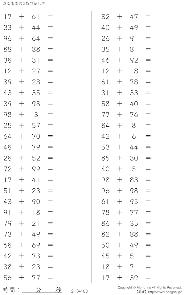 上記のボタンから「200未満の2桁の足し算」の算数数学ドリル・計算ドリル(PDFプリント)がダウンロードできます。個人利用は無料です(家庭以外での配布は有料です)。