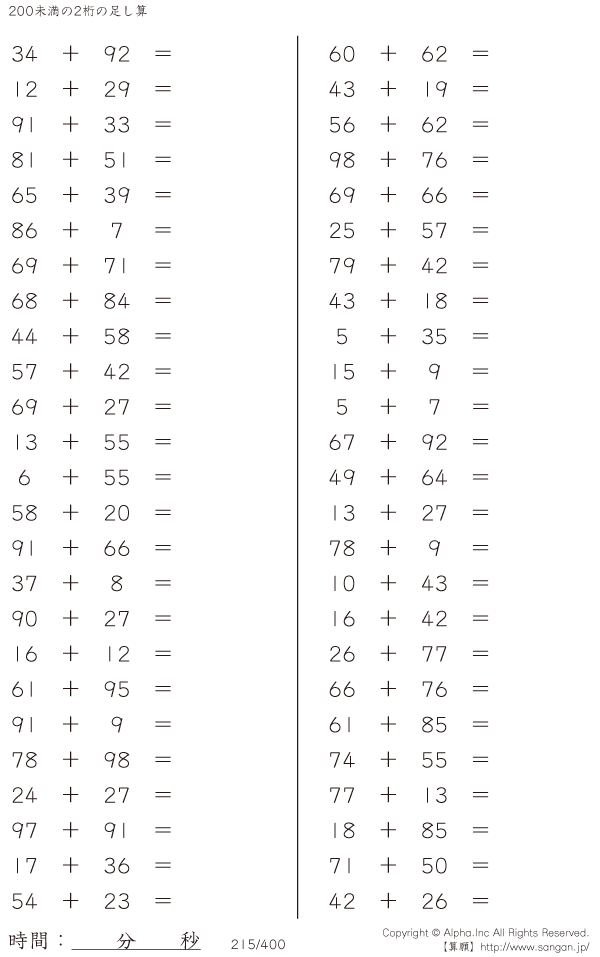 上記のボタンから「200未満の2桁の足し算」の算数数学ドリル・計算ドリル(PDFプリント)がダウンロードできます。個人利用は無料です(家庭以外での配布は有料です)。