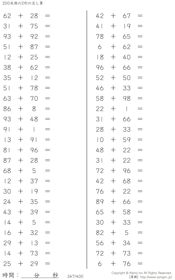 上記のボタンから「200未満の2桁の足し算」の算数数学ドリル・計算ドリル(PDFプリント)がダウンロードできます。個人利用は無料です(家庭以外での配布は有料です)。