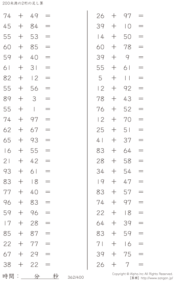上記のボタンから「200未満の2桁の足し算」の算数数学ドリル・計算ドリル(PDFプリント)がダウンロードできます。個人利用は無料です(家庭以外での配布は有料です)。
