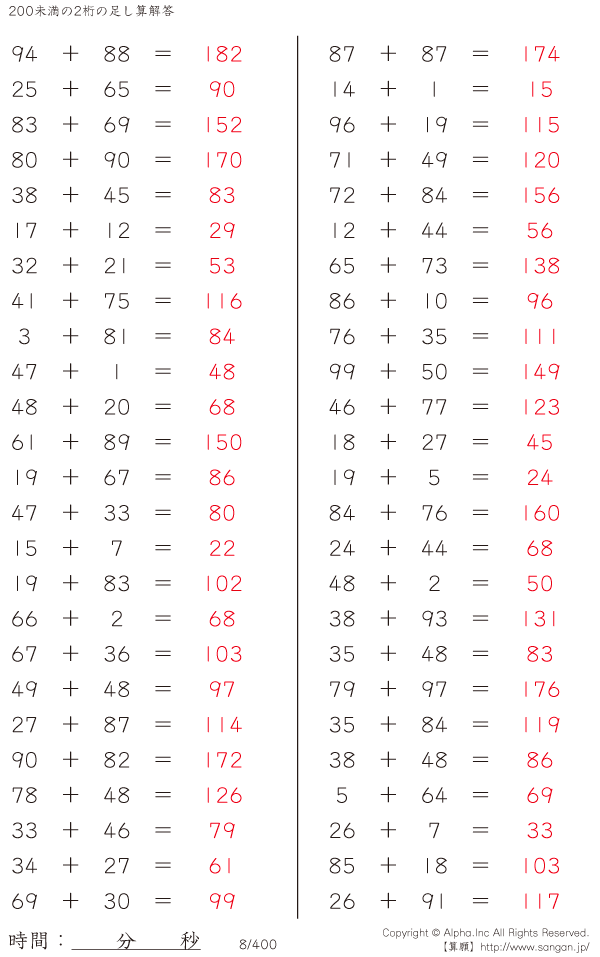 上記のボタンから「200未満の2桁の足し算」の算数数学ドリル・計算ドリル(PDFプリント)がダウンロードできます。個人利用は無料です(家庭以外での配布は有料です)。