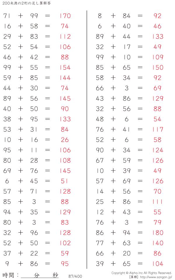 上記のボタンから「200未満の2桁の足し算」の算数数学ドリル・計算ドリル(PDFプリント)がダウンロードできます。個人利用は無料です(家庭以外での配布は有料です)。