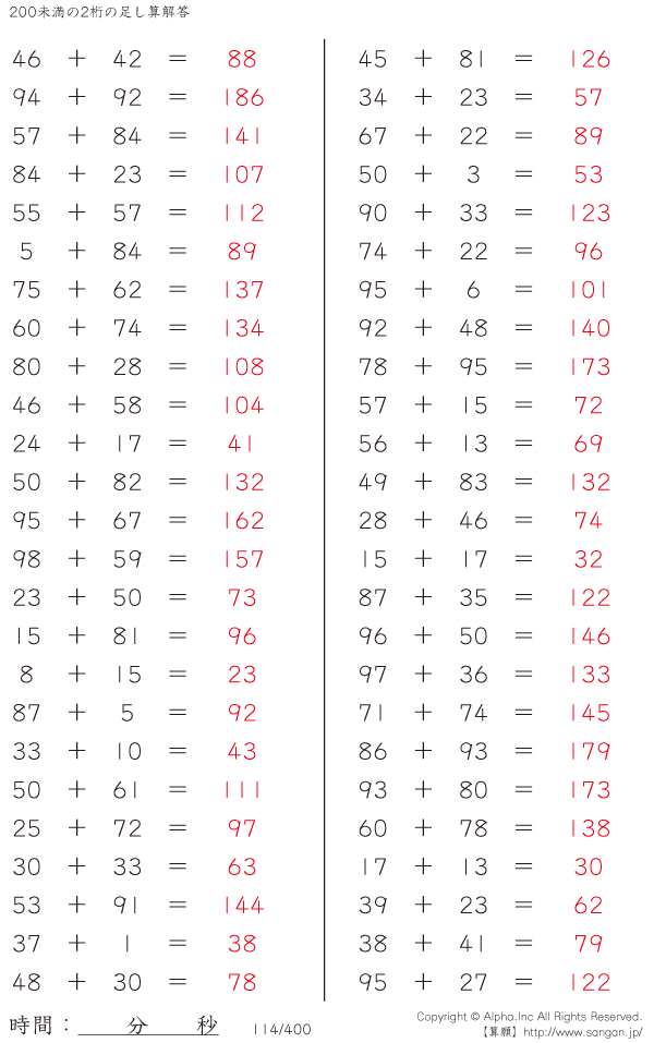 上記のボタンから「200未満の2桁の足し算」の算数数学ドリル・計算ドリル(PDFプリント)がダウンロードできます。個人利用は無料です(家庭以外での配布は有料です)。