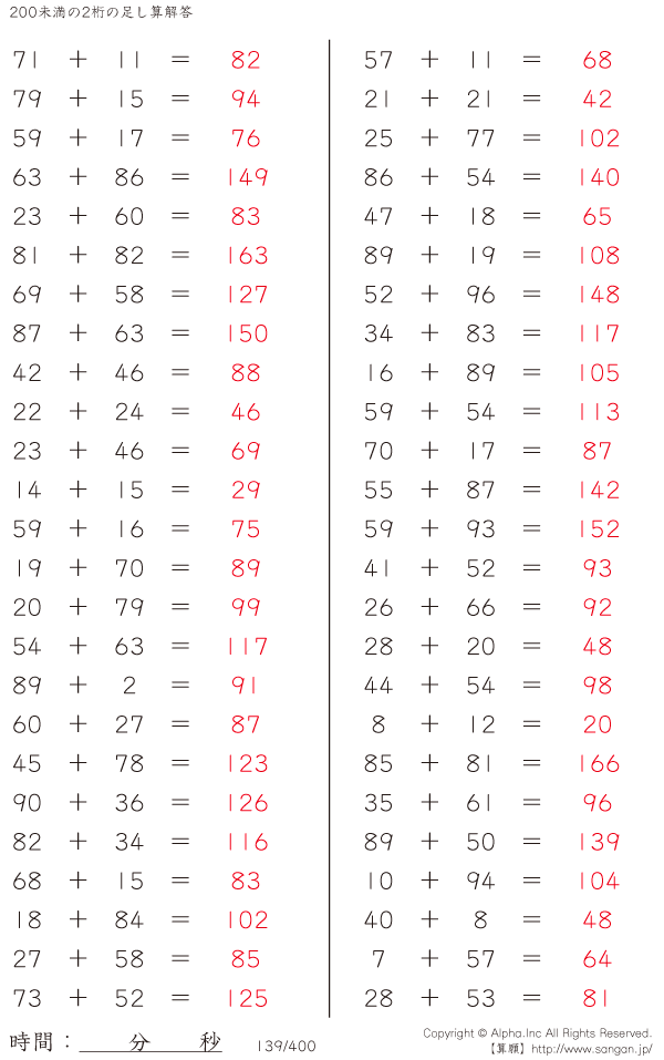 上記のボタンから「200未満の2桁の足し算」の算数数学ドリル・計算ドリル(PDFプリント)がダウンロードできます。個人利用は無料です(家庭以外での配布は有料です)。