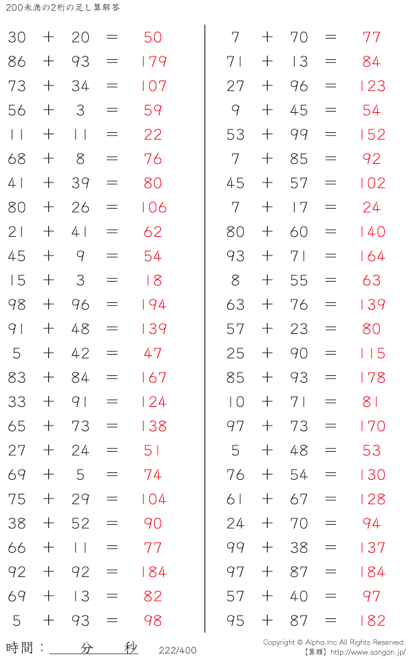 上記のボタンから「200未満の2桁の足し算」の算数数学ドリル・計算ドリル(PDFプリント)がダウンロードできます。個人利用は無料です(家庭以外での配布は有料です)。