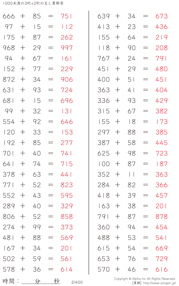 1000未満の3桁+2桁の足し算 [解答]002/400