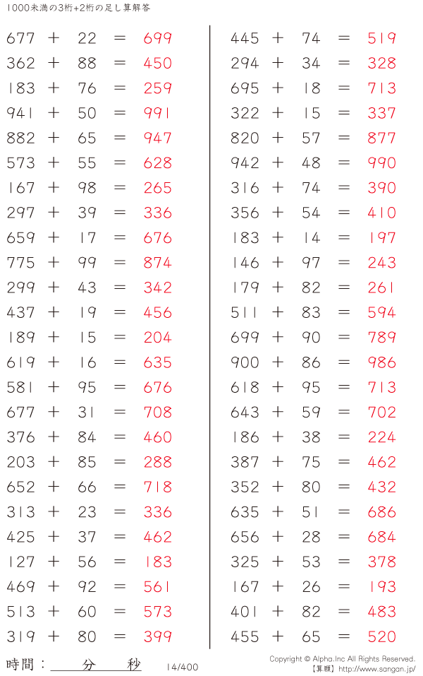 1000未満の3桁+2桁の足し算 [解答]014/400