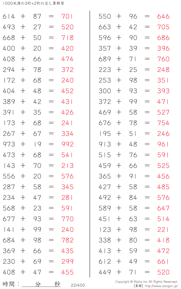1000未満の3桁+2桁の足し算 [解答]022/400