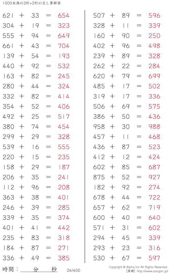 1000未満の3桁+2桁の足し算 [解答]024/400