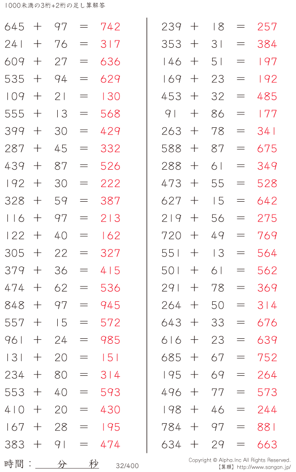 1000未満の3桁+2桁の足し算 [解答]032/400