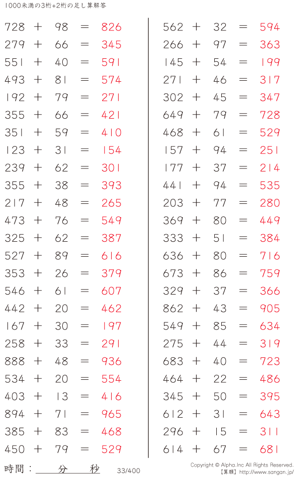 1000未満の3桁+2桁の足し算 [解答]033/400