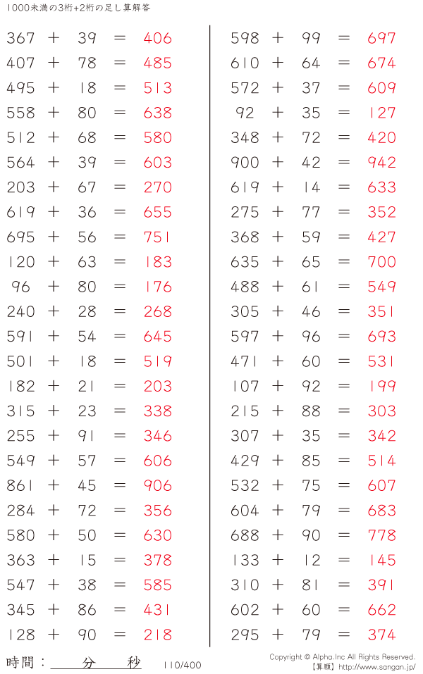 1000未満の3桁+2桁の足し算 [解答]110/400