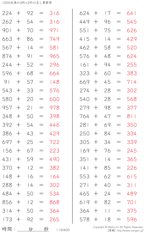 1000未満の3桁+2桁の足し算 [解答]115/400
