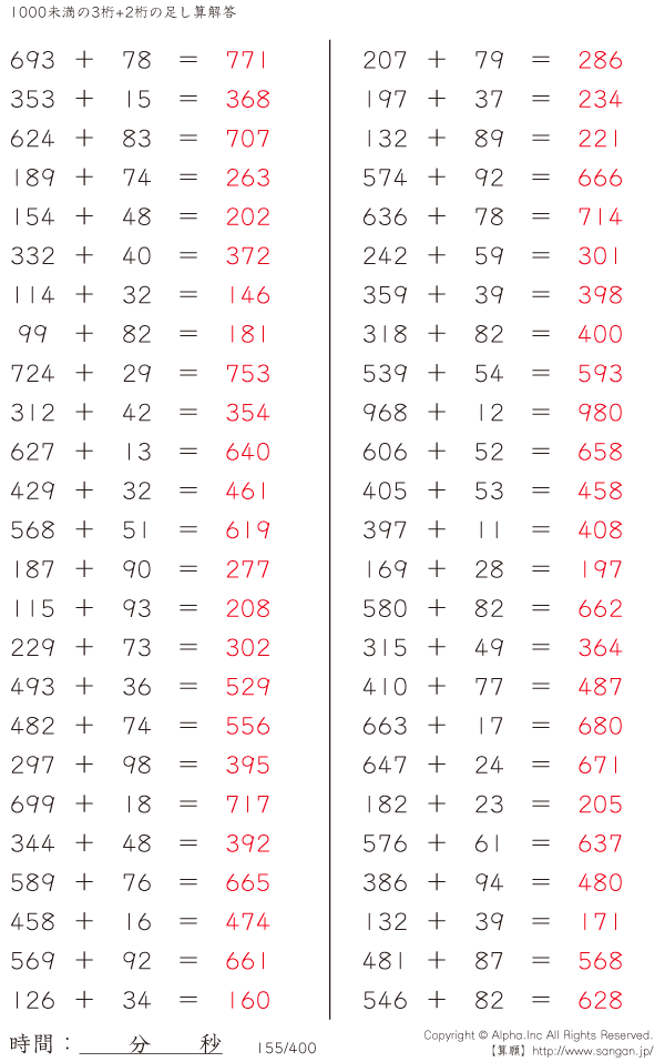 1000未満の3桁+2桁の足し算 [解答]155/400