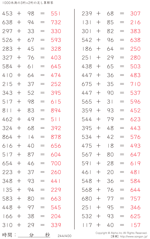 1000未満の3桁+2桁の足し算 [解答]244/400