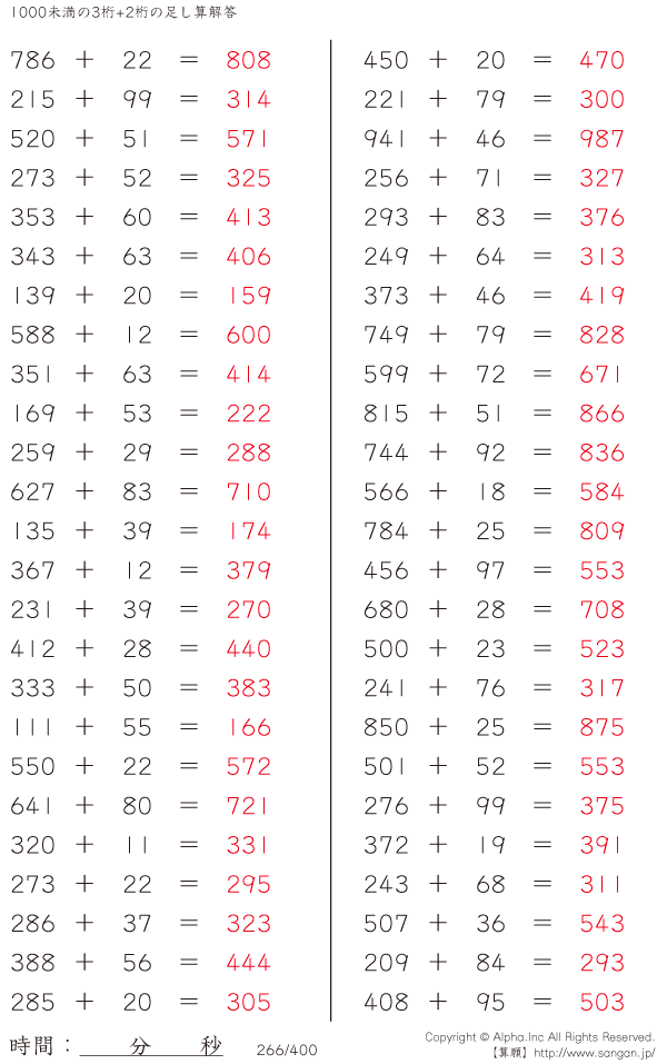 1000未満の3桁+2桁の足し算 [解答]266/400