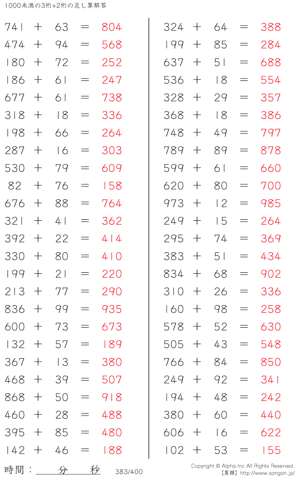 1000未満の3桁+2桁の足し算 [解答]383/400