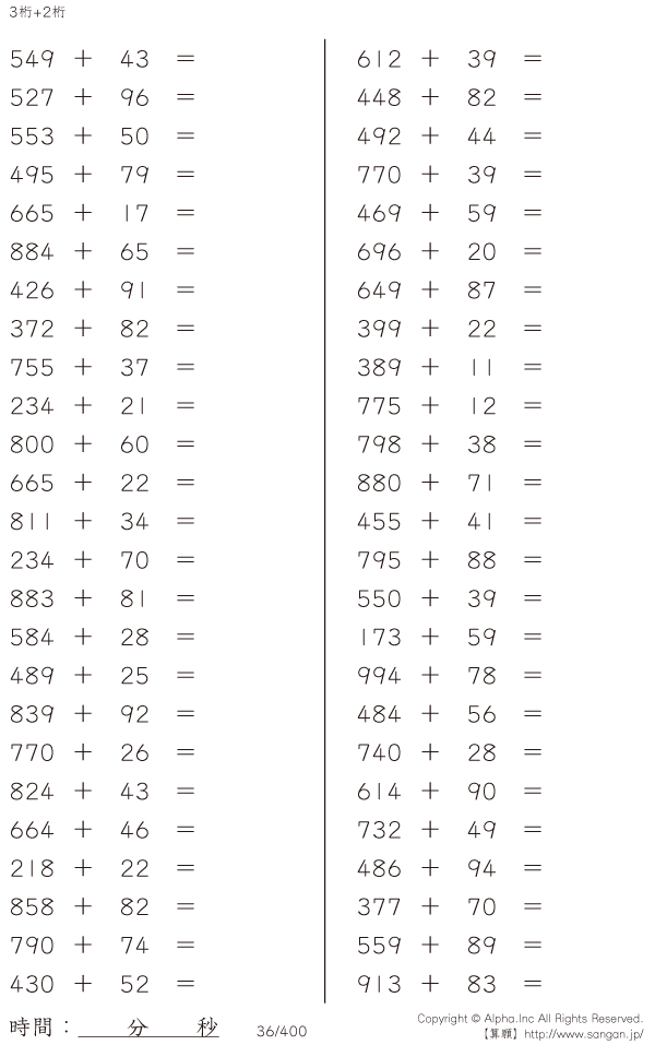 上記のボタンから「3桁+2桁の足し算」の算数数学ドリル・計算ドリル(PDFプリント)がダウンロードできます。個人利用は無料です(家庭以外での配布は有料です)。