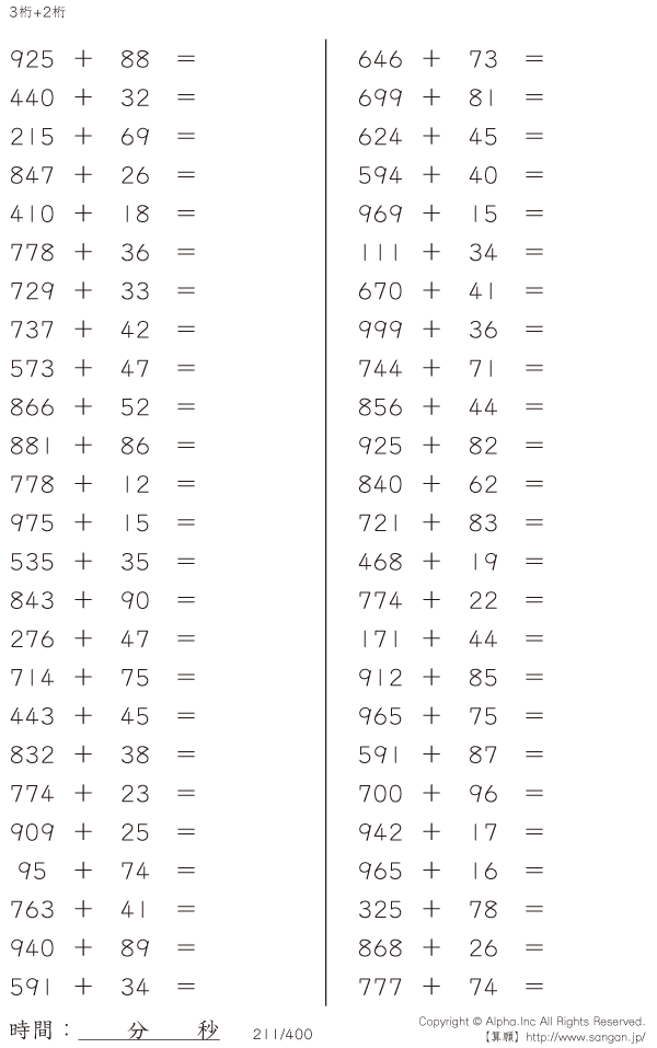 上記のボタンから「3桁+2桁の足し算」の算数数学ドリル・計算ドリル(PDFプリント)がダウンロードできます。個人利用は無料です(家庭以外での配布は有料です)。