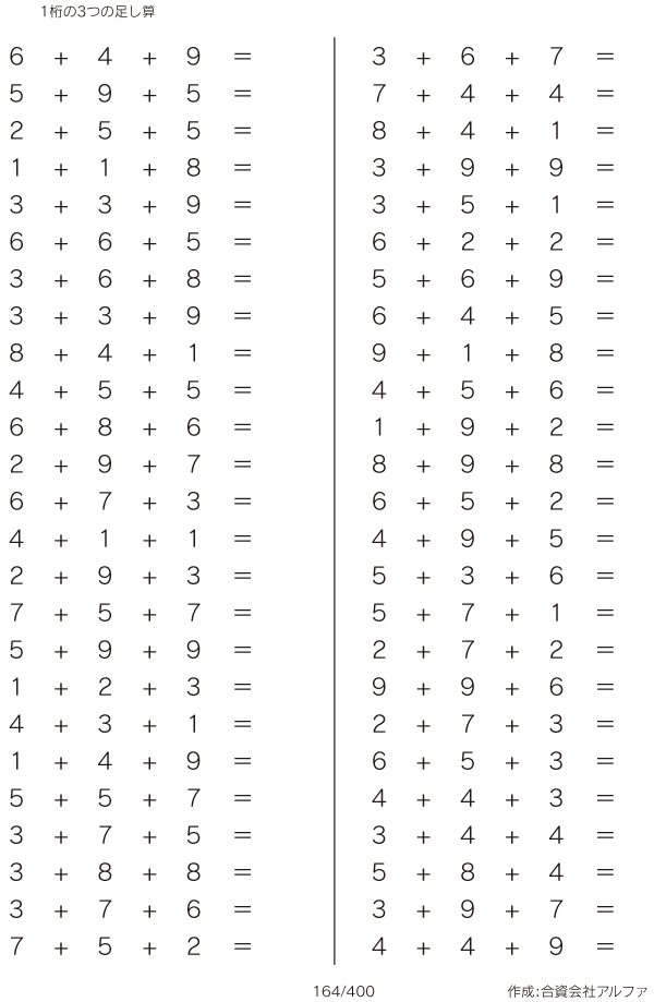 上記のボタンから「1桁の3つの足し算」の算数数学ドリル・計算ドリル(PDFプリント)がダウンロードできます。個人利用は無料です(家庭以外での配布は有料です)。
