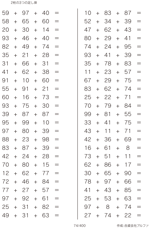 上記のボタンから「2桁の3つの足し算」の算数数学ドリル・計算ドリル(PDFプリント)がダウンロードできます。個人利用は無料です(家庭以外での配布は有料です)。