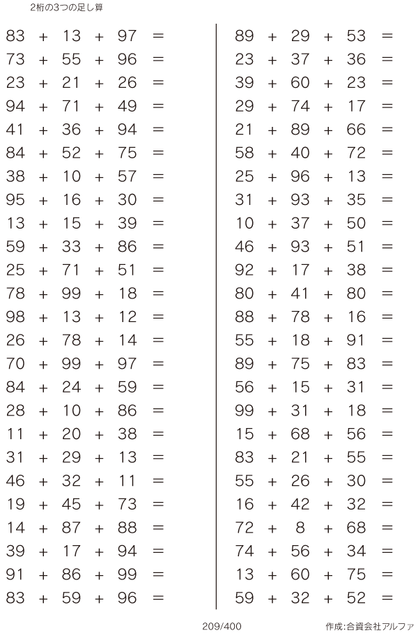 上記のボタンから「2桁の3つの足し算」の算数数学ドリル・計算ドリル(PDFプリント)がダウンロードできます。個人利用は無料です(家庭以外での配布は有料です)。