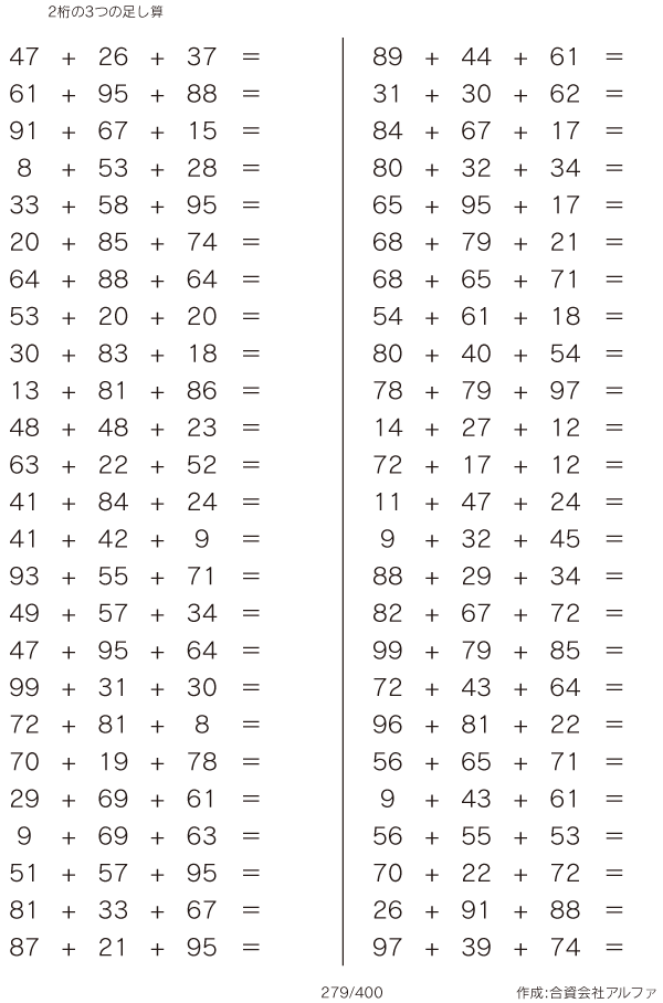 上記のボタンから「2桁の3つの足し算」の算数数学ドリル・計算ドリル(PDFプリント)がダウンロードできます。個人利用は無料です(家庭以外での配布は有料です)。