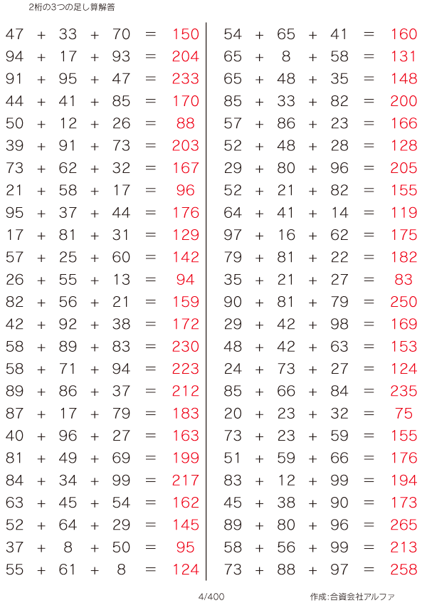 上記のボタンから「2桁の3つの足し算」の算数数学ドリル・計算ドリル(PDFプリント)がダウンロードできます。個人利用は無料です(家庭以外での配布は有料です)。