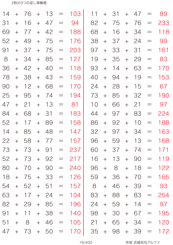 上記のボタンから「2桁の3つの足し算」の算数数学ドリル・計算ドリル(PDFプリント)がダウンロードできます。個人利用は無料です(家庭以外での配布は有料です)。